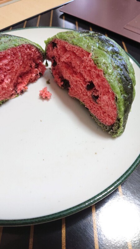 朝ご飯は地元のパン屋カフェ。スイカパンはテイクアウト。